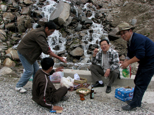 鐘揚(右二)與西藏大學(xué)師生在西藏采集種子時在野外用餐。(資料照片)