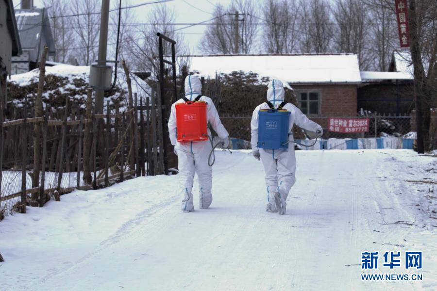 2月1日,消防隊(duì)員在望奎縣惠七鎮(zhèn)惠七村進(jìn)行公共區(qū)域消殺。新華社發(fā)