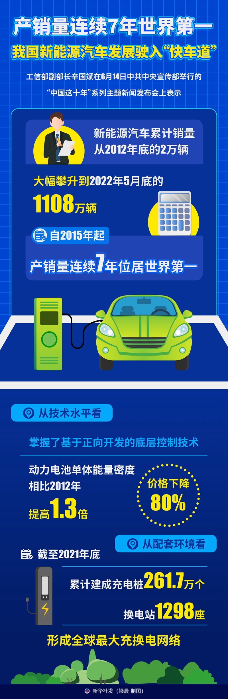 發(fā)展新能源汽車是我國從汽車大國邁向汽車強國的必由之路。黨的十八大以來,我國深入實施新能源汽車國家戰(zhàn)略,強化頂層設(shè)計和創(chuàng)新驅(qū)動,新能源汽車產(chǎn)業(yè)實現(xiàn)快速發(fā)展。從產(chǎn)銷規(guī)???,新能源汽車累計銷量從2012年底的2萬輛,大幅攀升到今年5月底的1108萬輛。從技術(shù)水平看,掌握了基于正向開發(fā)的底層控制技術(shù),動力電池單體能量密度相比2012年提高1.3倍、價格下降80%。從配套環(huán)境看,截至2021年底,累計建成充電樁261.7萬個、換電站1298座,形成全球最大充換電網(wǎng)絡(luò)。