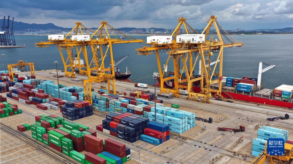 在遼寧省大連市遼寧港口集團(tuán)大連港集裝箱碼頭,貨輪在裝卸集裝箱(2020年9月24日攝,無人機(jī)照片)。新華社記者 姚劍鋒 攝