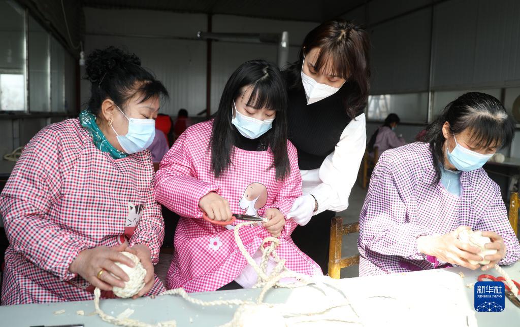 在遼寧省鞍山市臺(tái)安縣高力房鎮(zhèn)喬坨村,婦女在當(dāng)?shù)孛撠毊a(chǎn)業(yè)項(xiàng)目支持的工藝品廠里工作(2021年3月4日攝)。新華社記者 蔡湘鑫 攝