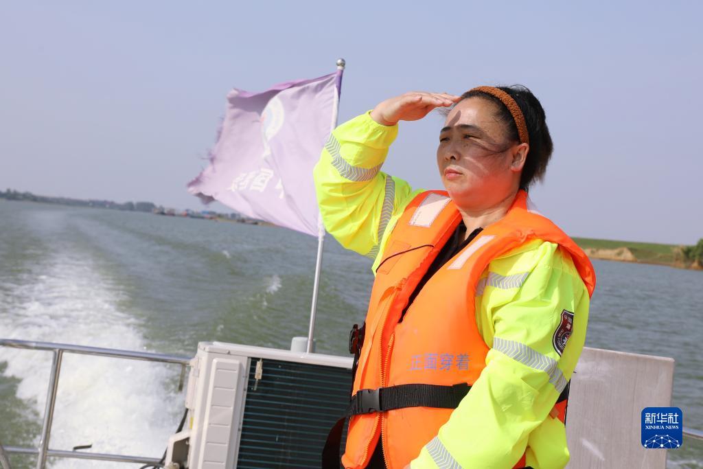 護魚員朱麗君在湖南省益陽市資江黃湖村河段巡護(2022年7月14日攝)。新華社發(fā)(盛擁軍攝)