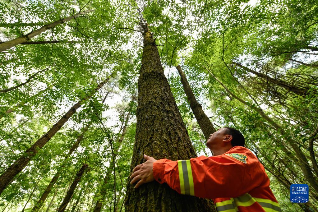 在貴州省貴陽市國(guó)家級(jí)森林公園,村級(jí)林長(zhǎng)郭健用手量一棵樹的直徑(2022年7月13日攝)。 新華社記者 楊文斌 攝