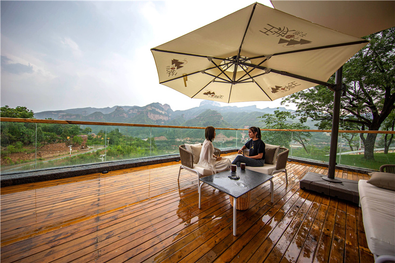 7月15日,游客在武安市活水鄉(xiāng)王坡民宿聊天?! 〗陙恚颖笔∥浒彩谢钏l(xiāng)依托當(dāng)?shù)刈匀簧鷳B(tài)優(yōu)勢,大力發(fā)展鄉(xiāng)村旅游,利用空閑民居打