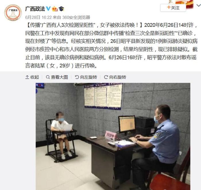 28日,廣西壯族自治區(qū)黨委政法委官方微博發(fā)布通報(bào)稱,2020年6月26日14時(shí)許,民警在工作中發(fā)現(xiàn)有網(wǎng)民在部分微信群中傳播檢查三次全是新